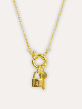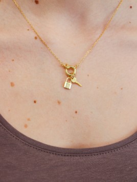 Nuestra gargantilla KEYLOCK está formada por una cadena fina de la que cuelgan dos charms: un candado y una llave. Estos van enganchados en un alargador que se puede abrir para poner y quitar los charms.