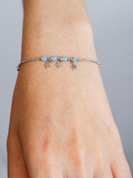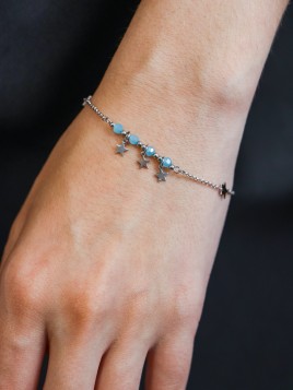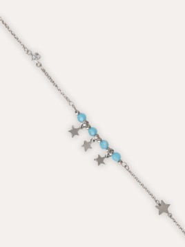 La pulsera TURQUEIS es una pulsera de cadena fina de plata formada por una cadena muy finita que contiene cuentas de color turquesa y estrellas pequeñitas que cuelgan de ella. Es una joya sencilla, original y combina genial con otras pulseras. Además es perfecta como regalo o autorregalo.