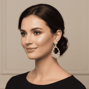 Pendiente con presencia y cuello sereno. Otra opción es foco en el escote con oreja limpia. En muñeca, una línea fina que acompaña.