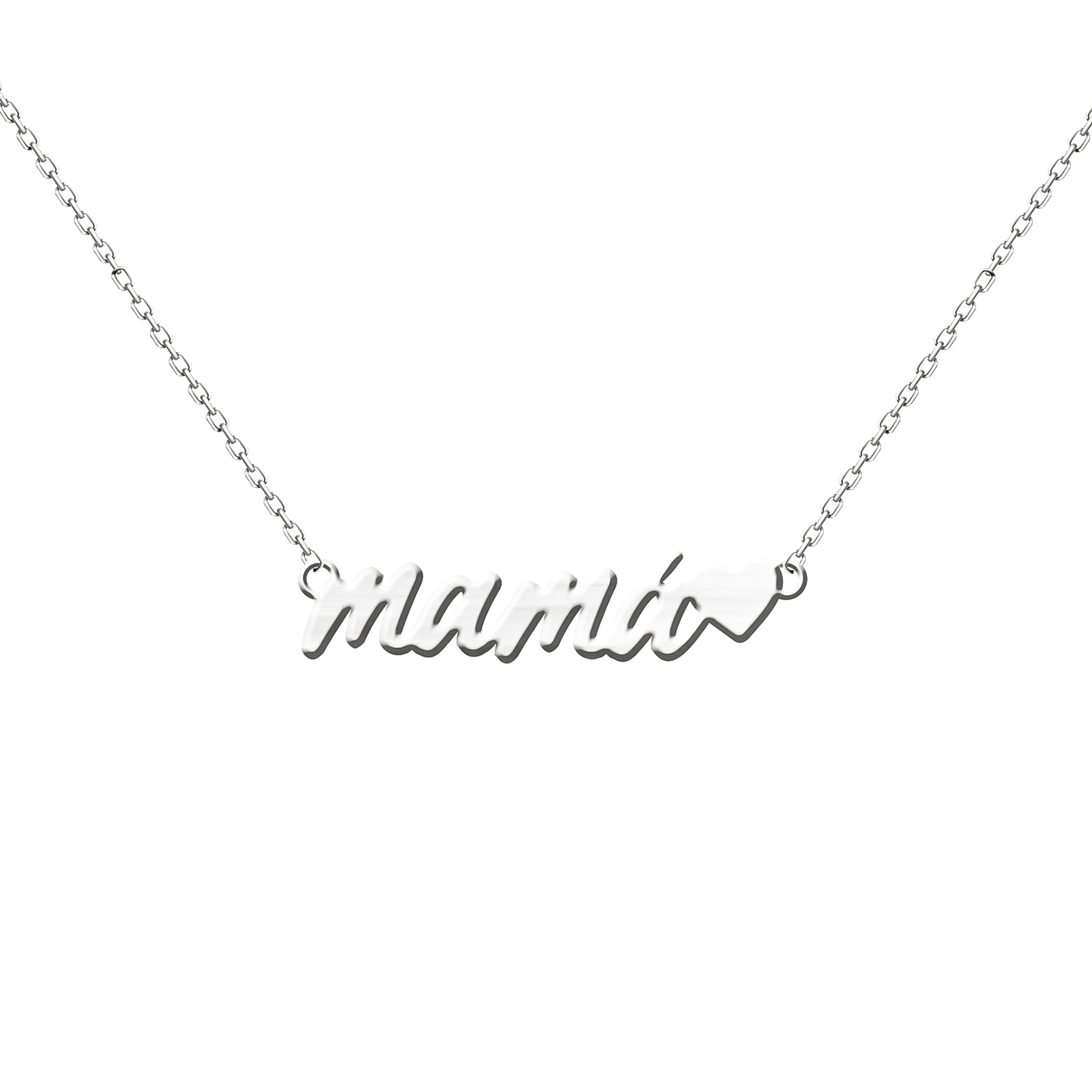 Collar de plata mamá personalizado con nombre y detalle de corazón, diseñado para crear una joya única y llena de significado. Este collar permite personalizar con el nombre que desees, convirtiéndose en un accesorio especial ideal para regalar a mamá. Su diseño delicado y elegante combina una tipografía moderna con un pequeño corazón que aporta un toque emocional. Fabricado en plata de ley 925, ofrece brillo, calidad y durabilidad, siendo perfecto para el uso diario o para ocasiones especiales. Es un regalo ideal para el Día de la Madre, cumpleaños o cualquier momento importante.